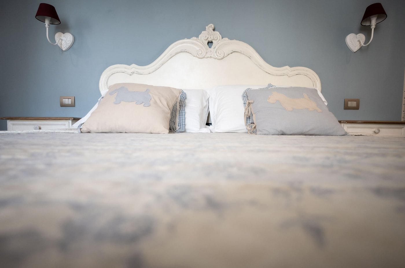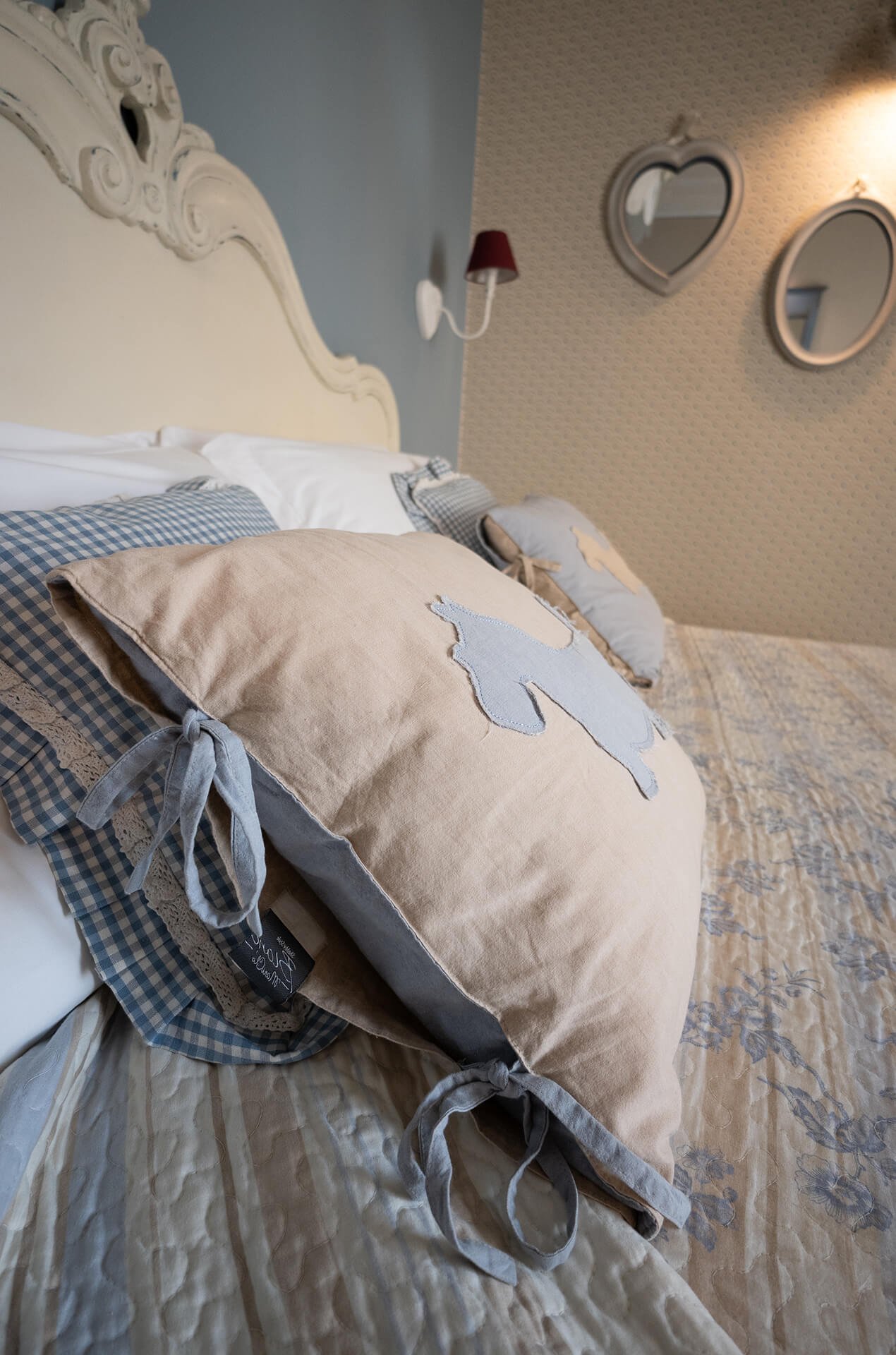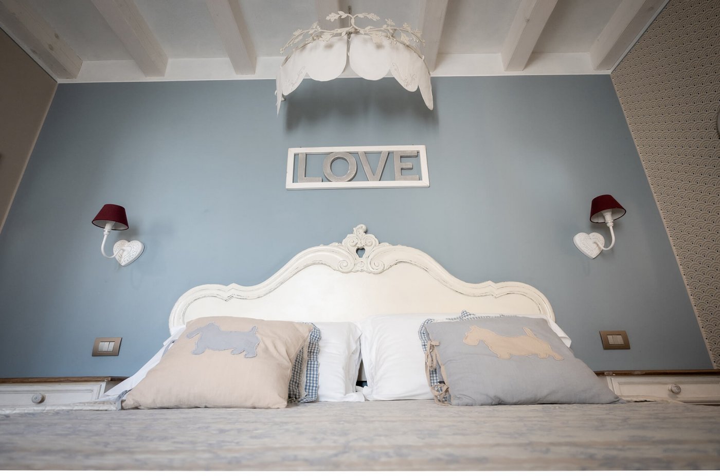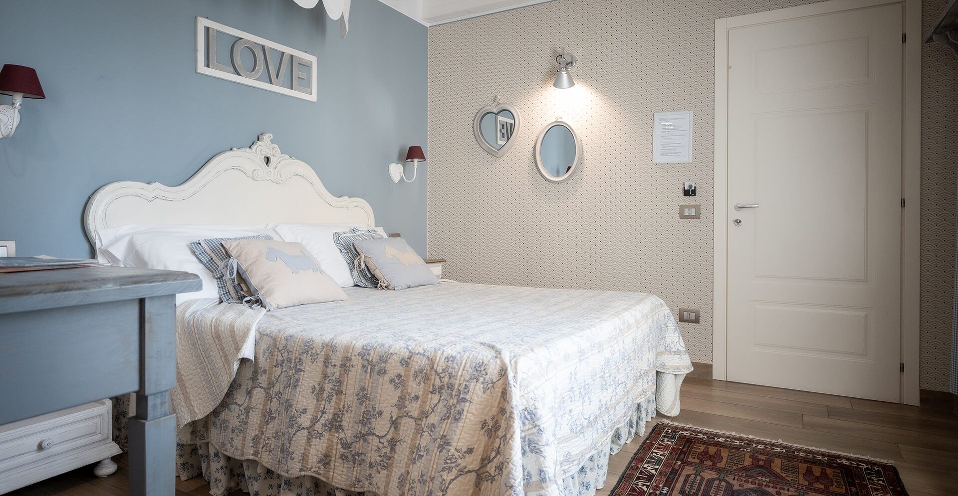 Deliziosa stanza matrimoniale, appartata e suggestiva nei toni del celeste shabby chic.