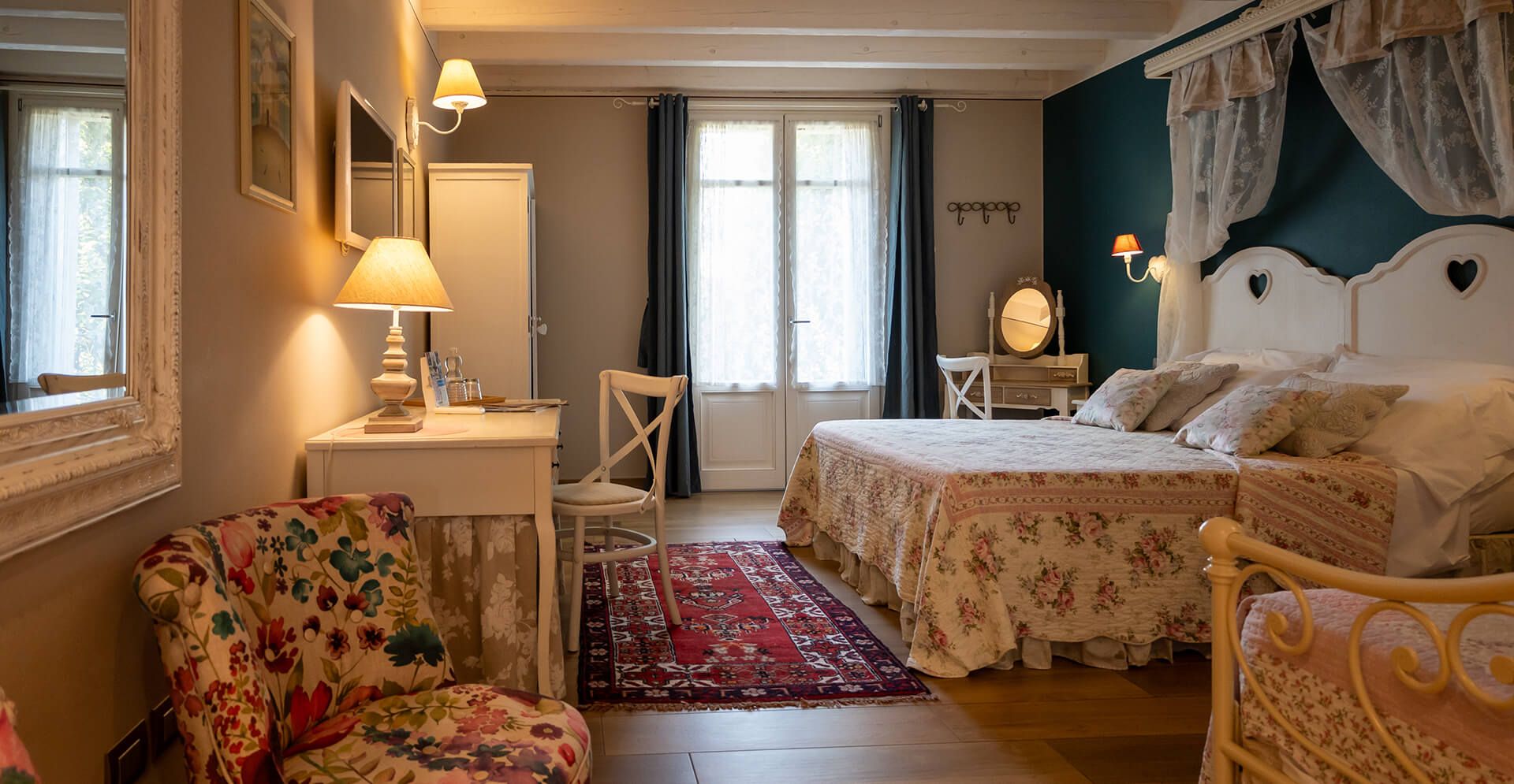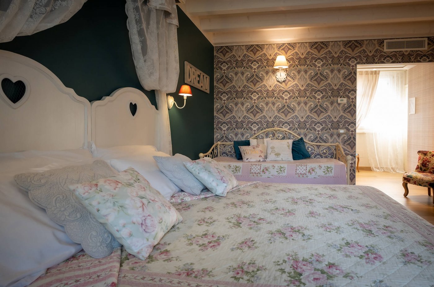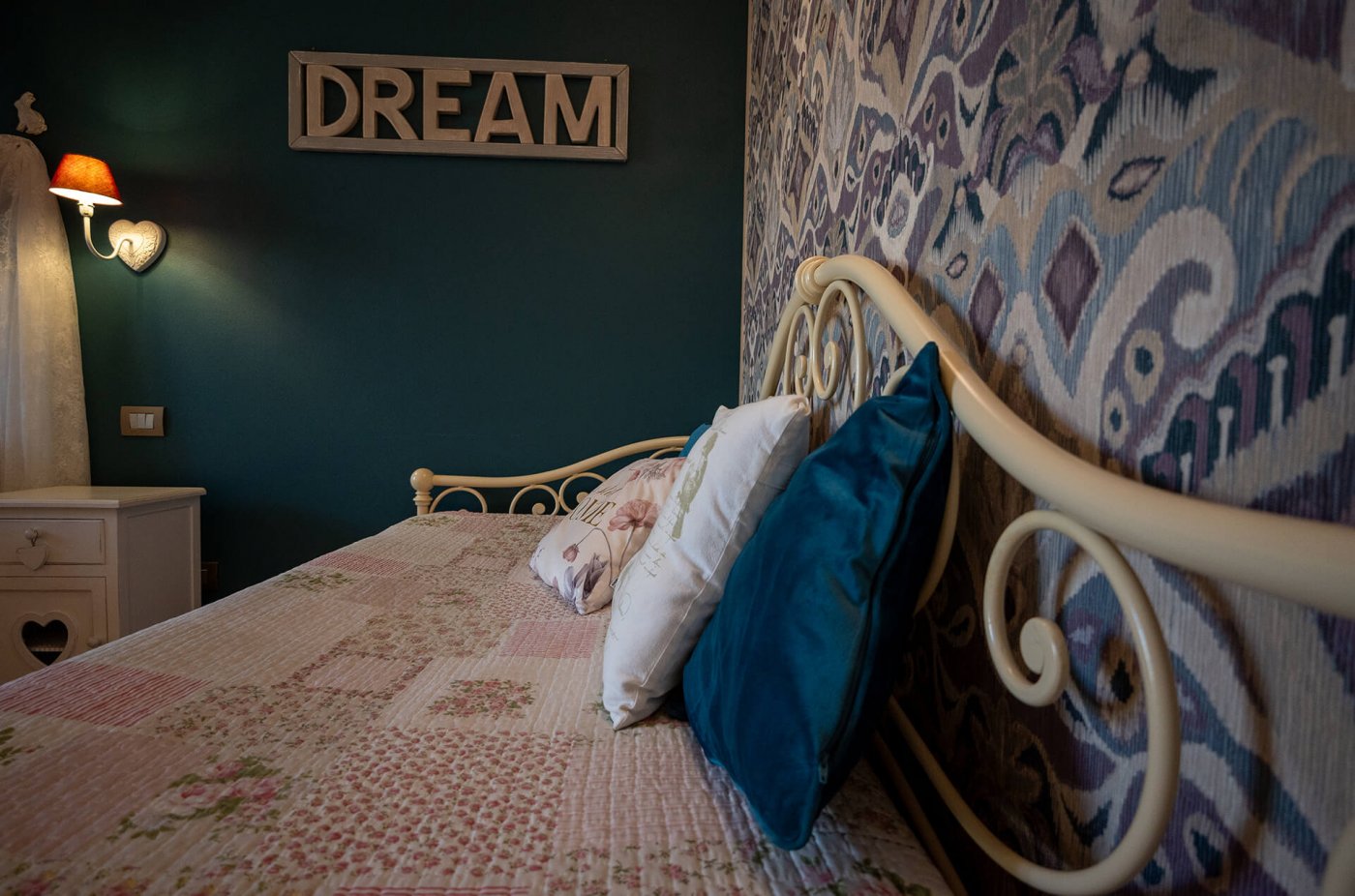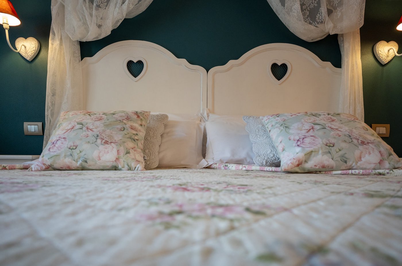 La camera dei sogni, la nostra stanza di più ampia metratura. Sui toni del marrone spicca l'arredamento bianco candido con cuori intarsiati. Tende in lino leggero e delicato con cuori tono su tono rendono l'ambiente molto elegante e particolare. La magia dei folletti portafortuna vi darà il benvenuto in questa stanza...