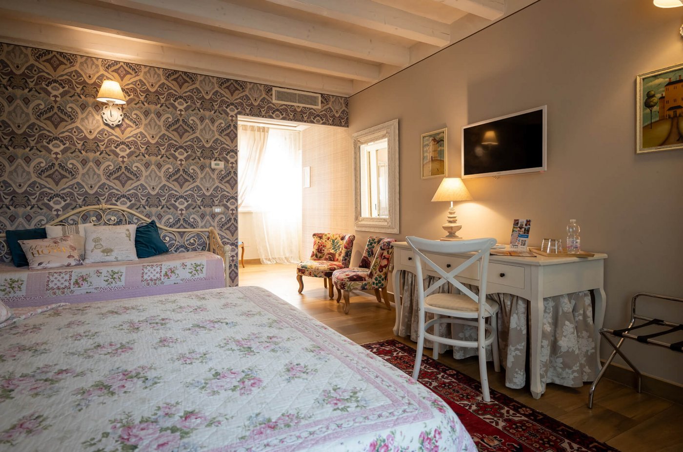 Una camera che può ospitare fino a 4 persone, dotata di 1 letto matrimoniale e possibilità di aggiunta di 2 letti singoli.